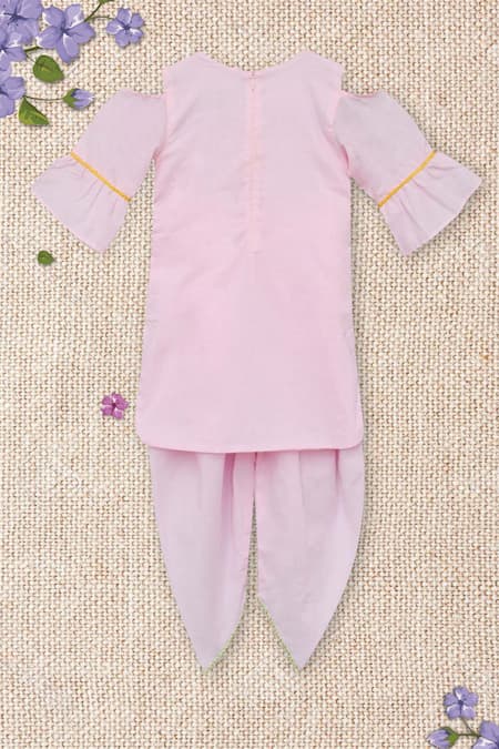 Pink kurta featuring bell sleeves and a round neckline. Paired with an embroidered short jacket and dhoti pant.