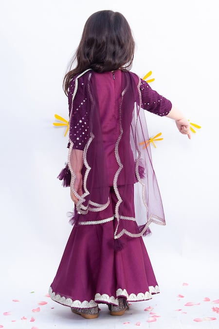 Wine kurta featuring mirror embroidered details and a round neckline. Paired with an embroidered sharara and a scalloped dupatta.