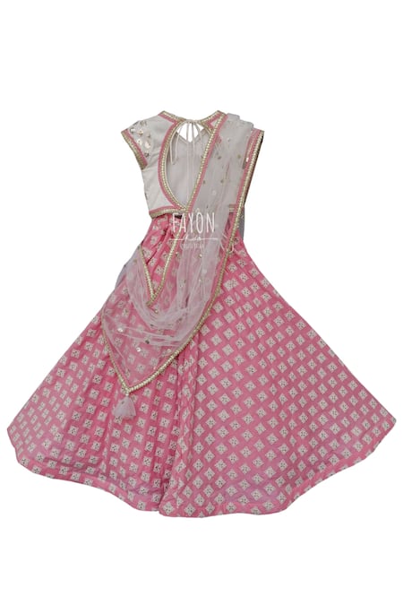 White sequined blouse featuring a V neckline and cap sleeves. Paired with a contrast peach-pink flared lehenga with a semi-elasticated waistband and a bordered dupatta.