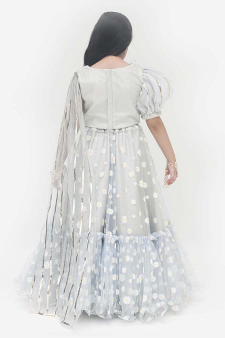 Floral applique work on lehenga, Pearl embellishments on blouse, One side puff sleeve with elasticated hem