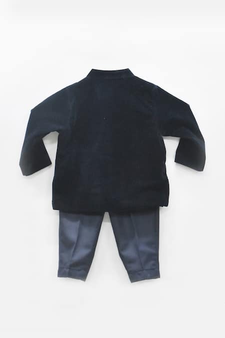 Dark blue velvet bandhgala featuring deer patch embroidery and concealed placket. Paired with cotton pants for a complete look.