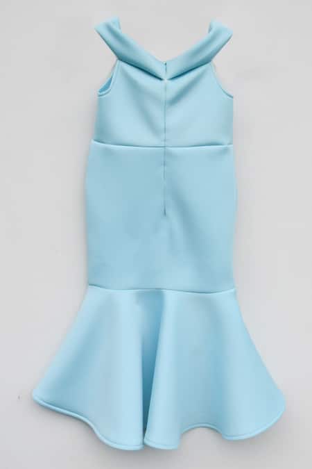 Blue fish cut dress featuring floral applique motifs and a boat neckline