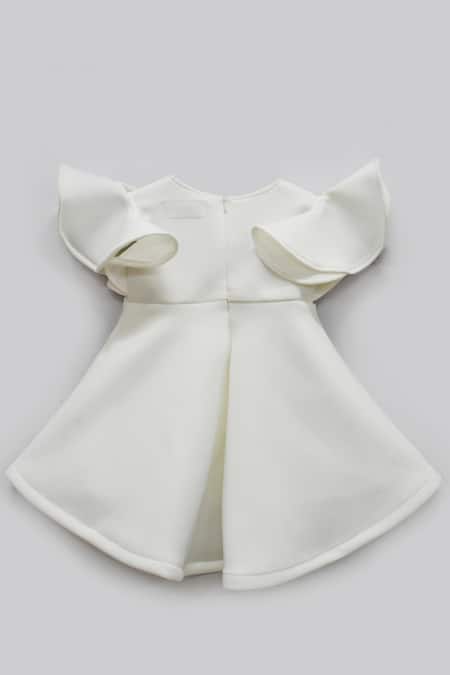 White dress featuring floral applique embroidered motifs and ruffle sleeves