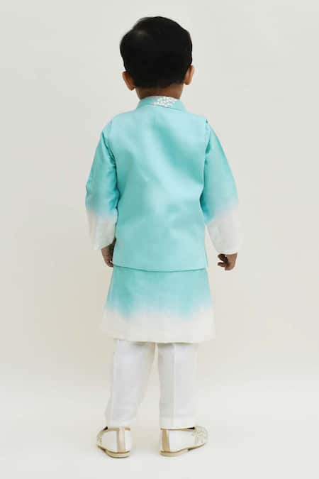 Blue kurta set featuring a floral embroidered Nehru jacket with welt pocket. Paired with a shaded kurta and pant, designed for kids.