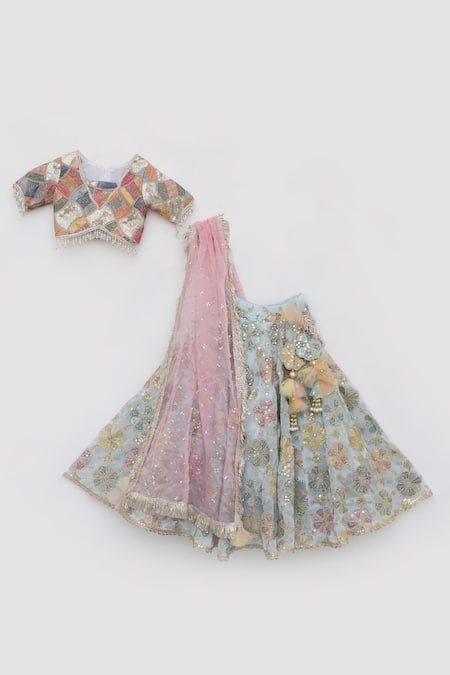 Off White Georgette, Organza Sequins, Beads, Zari, Floral Lehenga Set