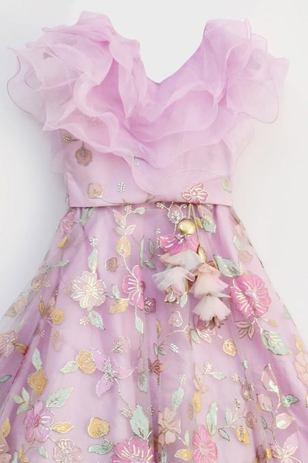 Lilac lehenga with floral embroidered motifs and sequin work. Paired with a ruffle blouse featuring a back hook closure.