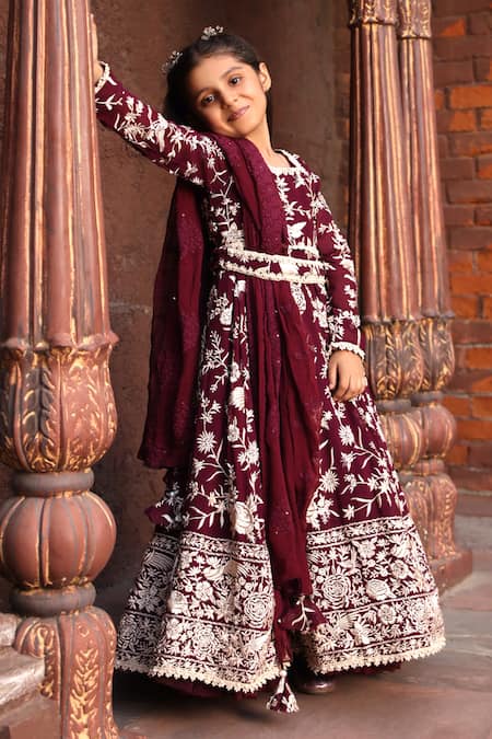 Maroon anarkali featuring floral Parsi work and a pearl crochet embroidered belt. Paired with a tassel bordered dupatta and pleated frill hem.