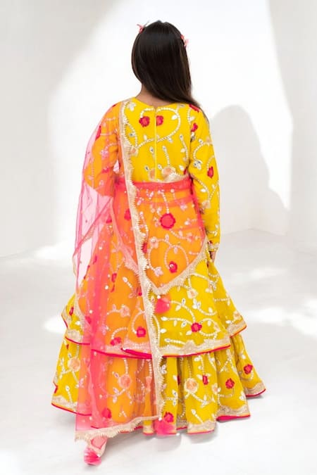 Buy_Fayon Kids_Yellow Net, Georgette Sequins, Tassels Gota Blossom Embroidered Anarkali Set _Online_at_Aza_Fashions