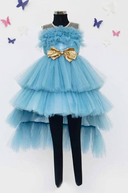 Blue high-low layered gown featuring tiered frills on the bodice and a shimmer bow on the waistline