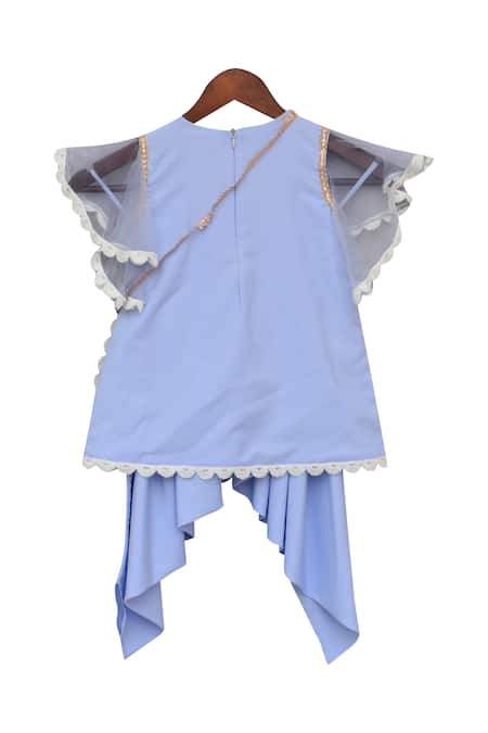 Blue kurta featuring ruffle sleeves and a back zippered closure. Paired with dhoti pants and a cute side sling pouch.