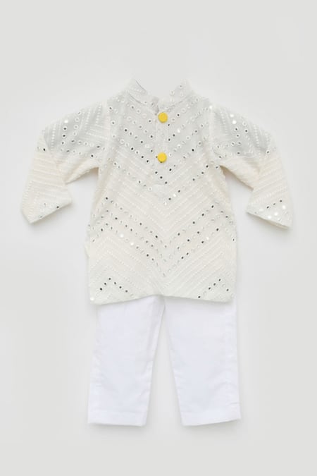 Off white kurta featuring mirror embroidery with a band collar and full sleeves. Paired with a matching pant made from silk fabric.