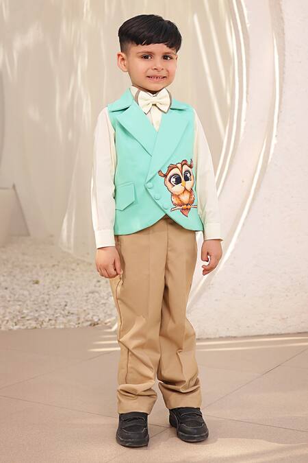 Forest green waistcoat featuring an intricate whimsical owl motif. Paired with a lemon yellow shirt and beige pant.