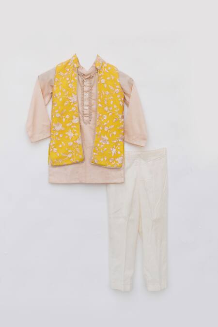 Yellow Cotton, Georgette Embroidery Floral Bundi And Kurta Set
