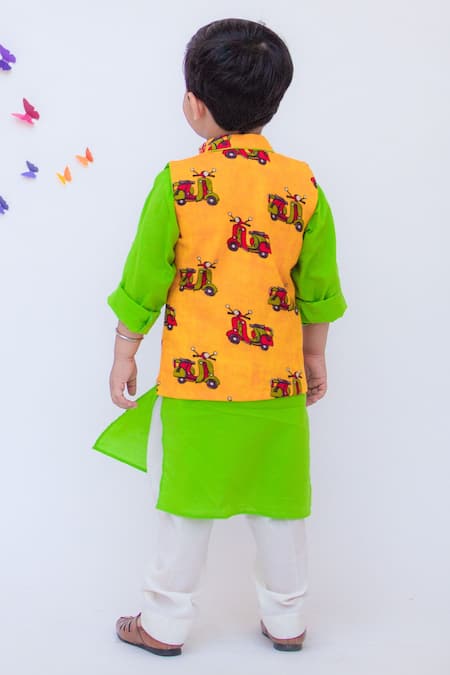 Yellow bundi with auto motif print featuring a mandarin collar. Paired with a green straight cut kurta and white straight cut pants.