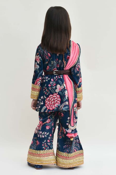 Blue velvet kurta featuring floral printed motifs with lace trim hems. Paired with sharara pants and a dupatta adorned with a lace border and tassels.