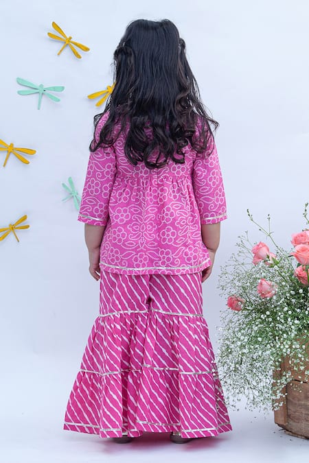 Pink kurta featuring bandhani prints, V neck, and three quarter sleeves. Paired with a leheriya sharara showcasing a striped pattern.
