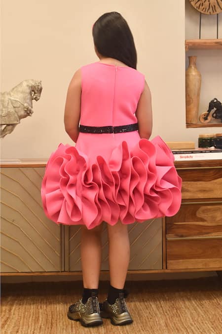 Pink lycra dress featuring ruffles detailing and a sequins embroidered waistband