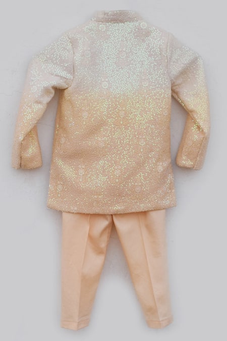 Peach georgette bandhgala featuring sequins embroidery and a mandarin collar. Paired with glace cotton pants for a complete look.
