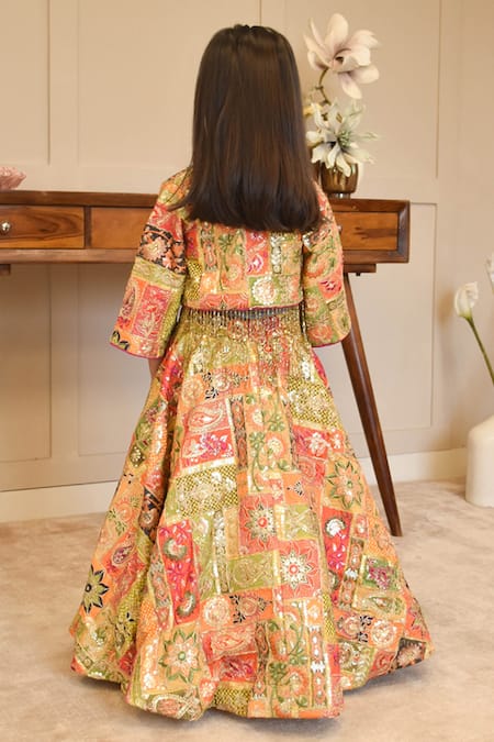Multi-colored lehenga featuring sequins and thread embroidery. Paired with a glace cotton crop top and a matching jacket.