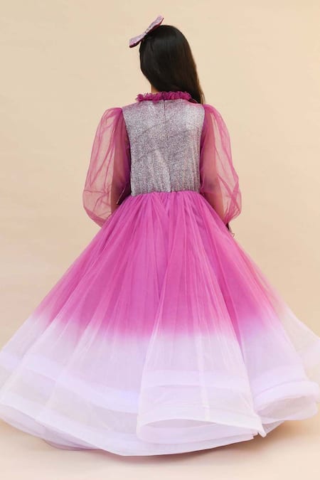 Purple gown featuring a round neckline with ruffle detail and sheer puff sleeves