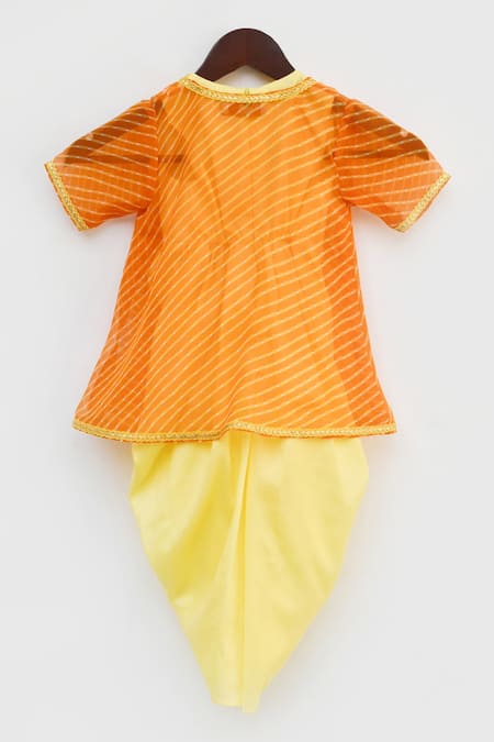 Yellow dhoti jumpsuit featuring a V neck and lace trim on the neckline. Paired with an orange leheriya print jacket adorned with leaf embroidery and a front tie-up closure.