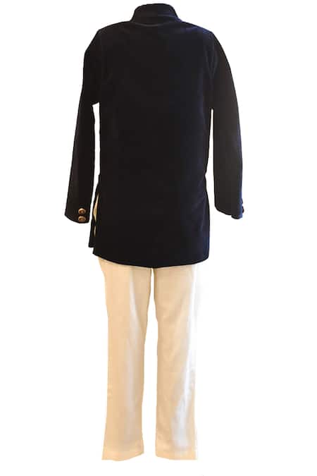 Buy_Fayon Kids_Blue Velvet, Cotton Solid Bandhgala With Pant _at_Aza_Fashions