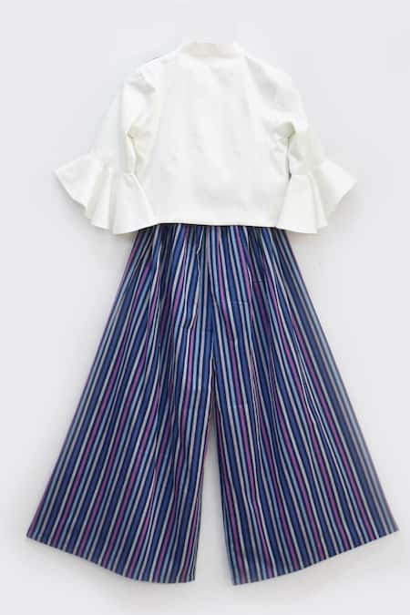 Off white tie-up top featuring bell sleeves and placement embroidered motifs. Paired with striped pant in blue and white hues.