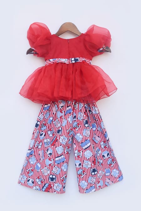 Red top featuring puffed sleeves, round neckline, and gathered detailing. Paired with car print palazzo and an attached tie-up printed belt with a bow on the waist.