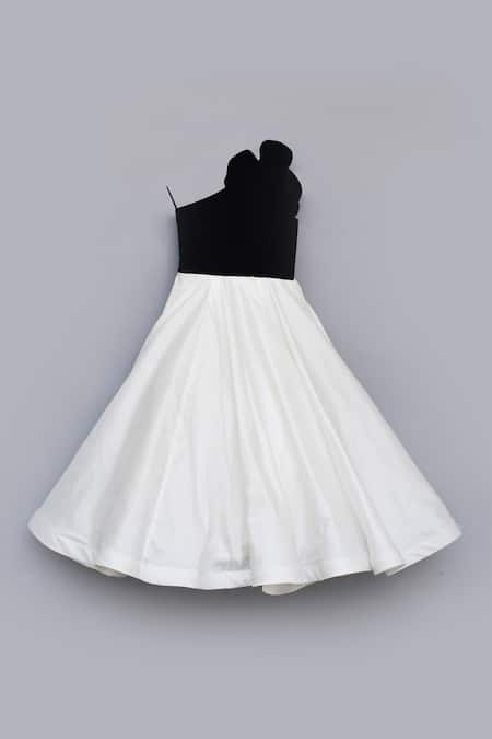 Black and white gown featuring a one-shoulder asymmetric neckline and floral embroidery