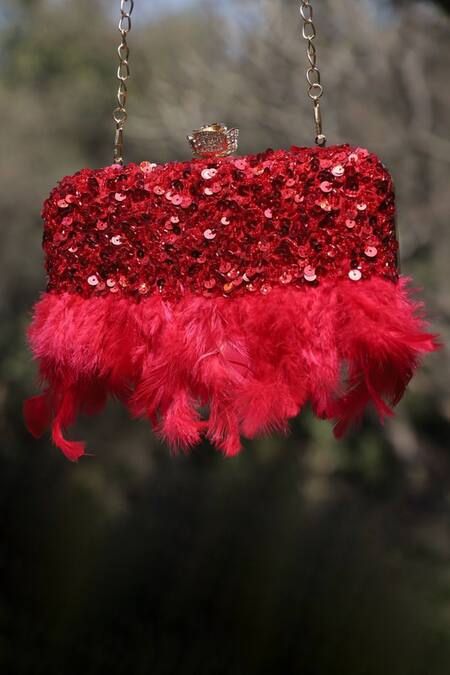 Red clutch featuring sequin work and a feather hem