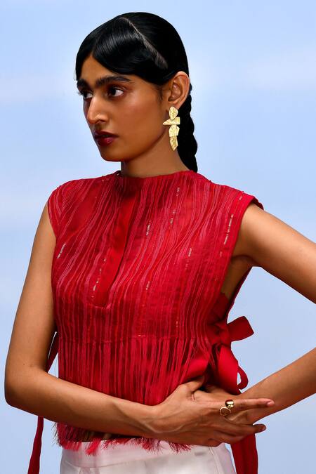 Red gilet featuring tonal threadwork and sequin patterns with a side tie closure. Paired with an inner cotton silk bustier.