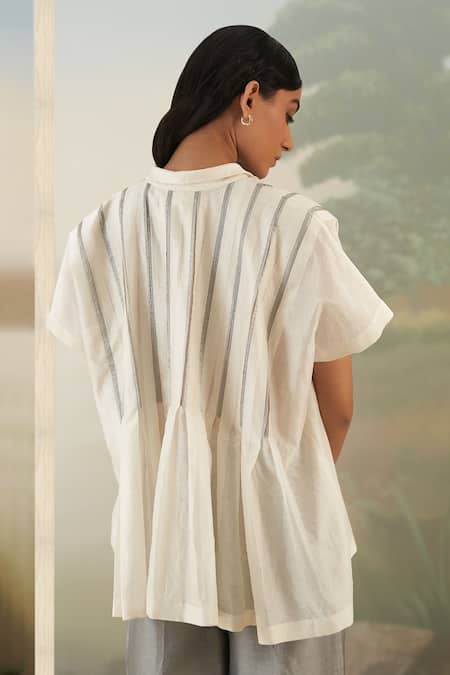 Off White Chanderi Plain Spread Collar Box Pleat Top