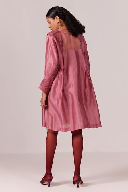 Pink Chanderi Embroidery Round Neck Pleated Dress