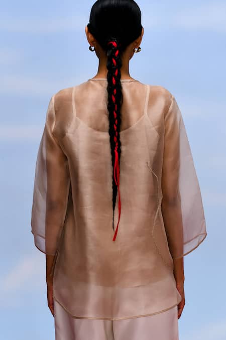 Beige sheer top featuring abstract hand embellished motifs at front and back. Paired with a camisole made of cotton for added comfort.