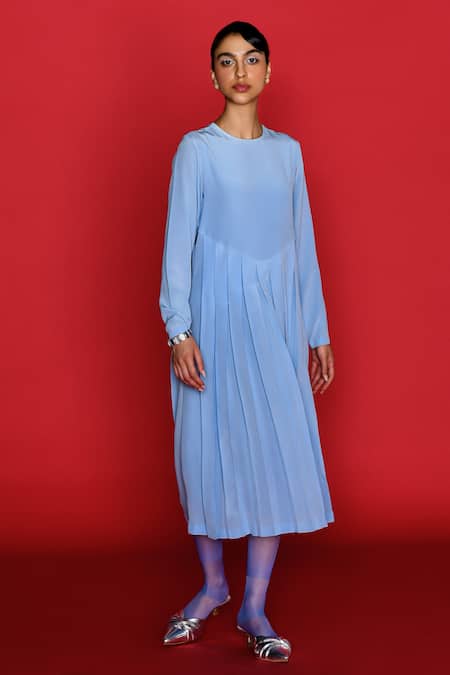 Blue Silk, Crepe Round Neck Elemental Solid Box-pleated Dress