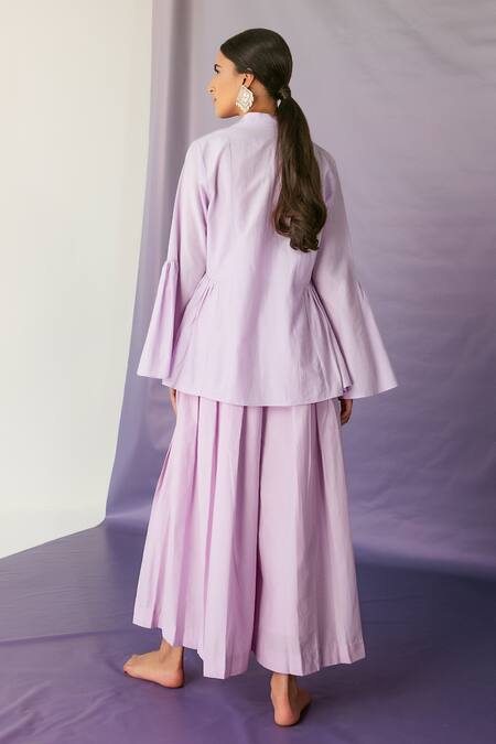 Lilac cotton silk jacket with band collar and flared sleeves. Comes with crop top and wide legged pants.