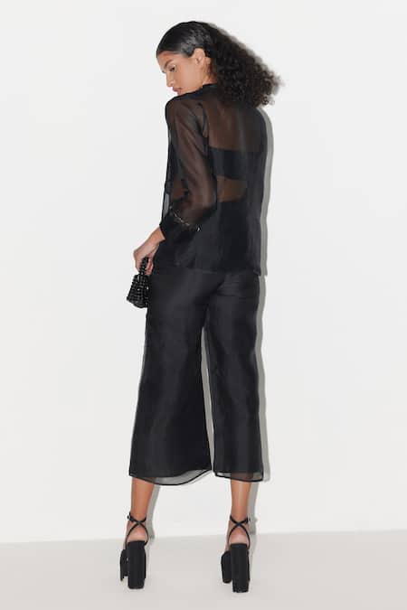 Black Silk Organza Embroidery Collared Floral Bloom Top
