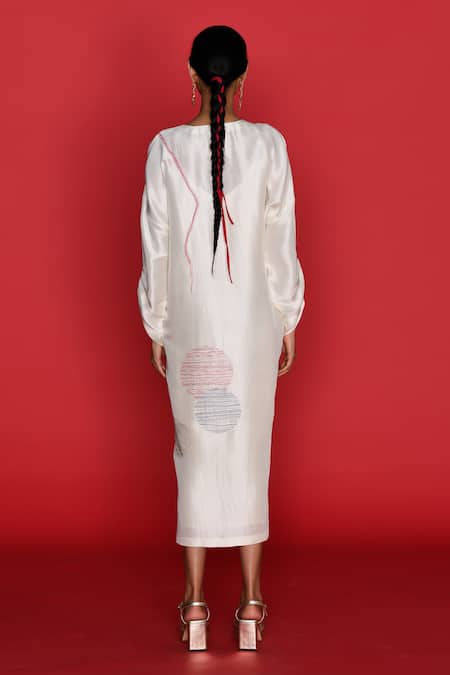 Off white kaftan dress featuring draped sleeves and V neckline with contrast thread embroidery in abstract patterns. Paired with a slip made of viscose crepe.