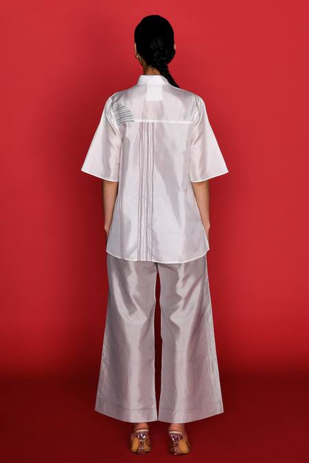 Grey wide legged trouser featuring ivory stitchline thread embroidery on the side seam panel