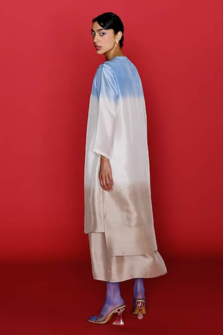 Off White Silk Embroidery Round Neck Ombre Asymmetric Tunic