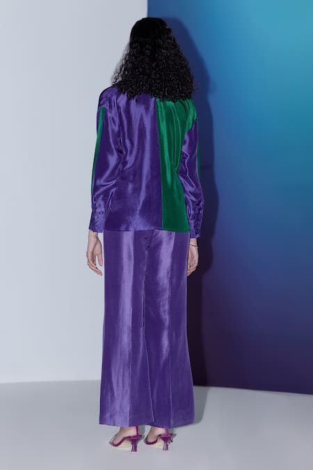 Green and purple color block shirt featuring a collared neck and three quarter sleeves