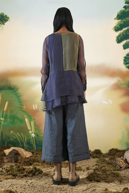 Olive & midnight blue sheer silk organza dual tone blue asymmetric gathered top. Paired up with a navy camisole.