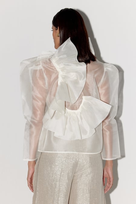 White silk organza top featuring layered ruffle panels and puff sleeves