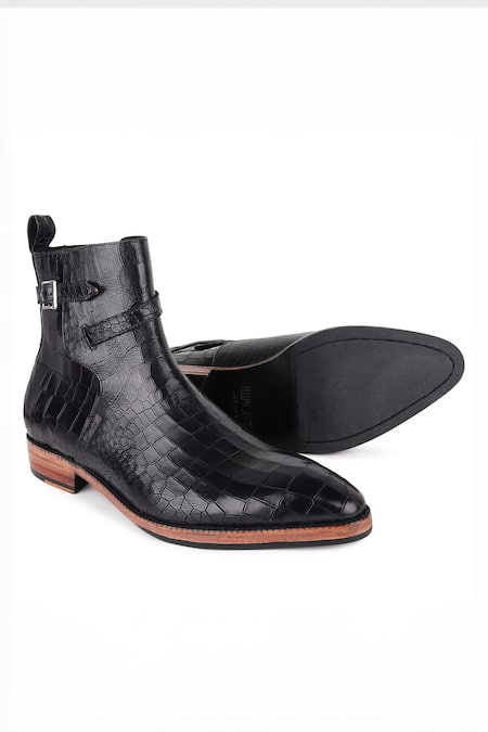 Black jodhpur boots featuring a croco mirror textured pattern and pointed toe detailing