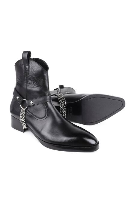 Black boots featuring chain embellishment on the buckle and pointed toe detailing