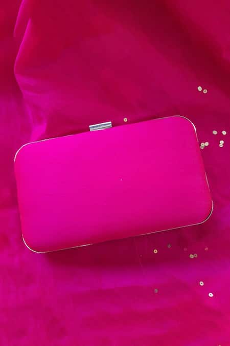 Pink clutch featuring a box shape with an all-over flower motif