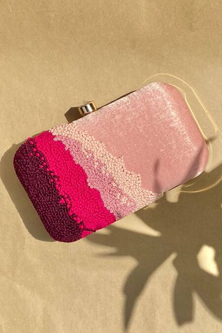 Pink clutch featuring placement thread embroidery in a waves pattern. Comes with a detachable sling chain for versatile carrying options.