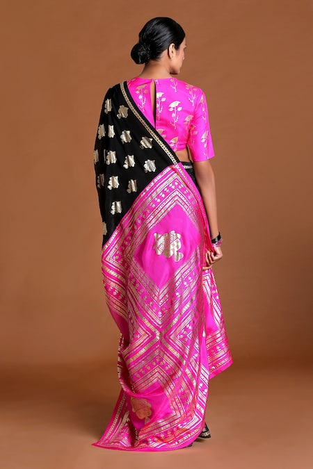 Black saree featuring all-over motifs in gold foil print and contrast hot pink palla. Comes with unstitched blouse piece.