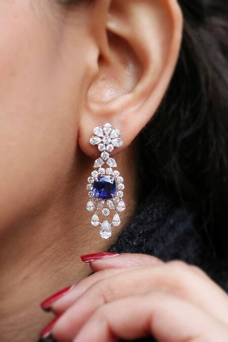 Floral motif with a blue stone centerpiece, Lab diamond embellishments, Drop design with intricate detailing