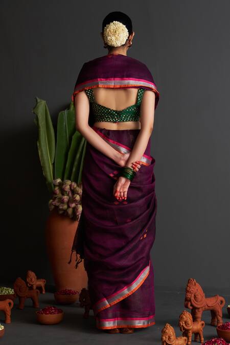 Purple linen saree featuring geometric motif woven details and stripes. Comes with a running blouse piece measuring 1 meter.